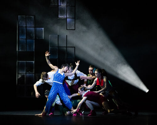 BDT also presented Shadows and Flame, a work originally commissioned for the Jewish Arts Collaborative for the Boston Museum of Fine Arts’ 2020 Hanukkah celebration. Envisioned as an exploration of light, shadow, and the dancing body, the opening scene, with five dancers lined up in a tight diagonal, and another section mid-way through where the dancers rise from the floor, remind me of those drawings that illustrate the evolution of mankind. Inspired by an 18th century Hanukkah oil lamp, the work has a grounded and ritualistic feel that is reminiscent of some of the works of Pilobolus – the unisex flash-toned tunics obscure the dancers’ individual identities and the dancers morph into and out of shapes, not emulating but rather embodying flames.