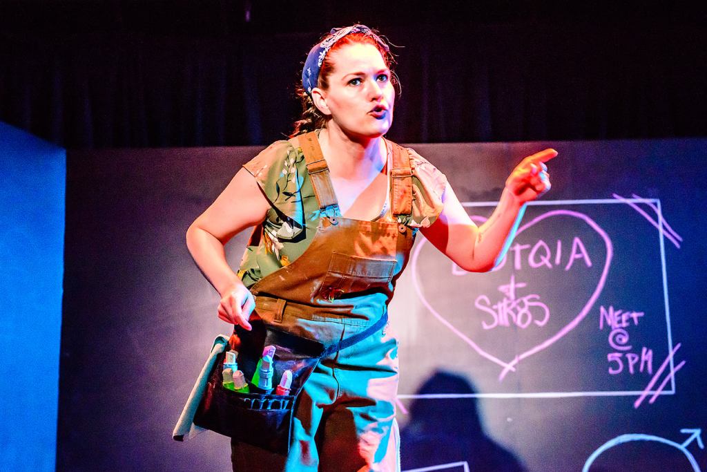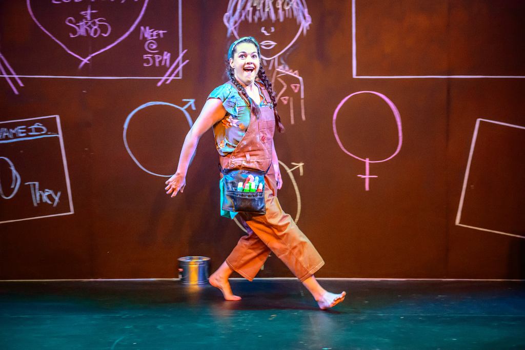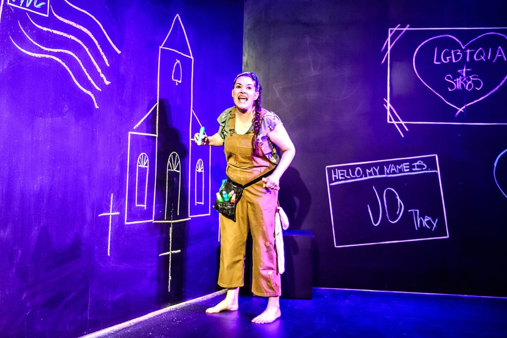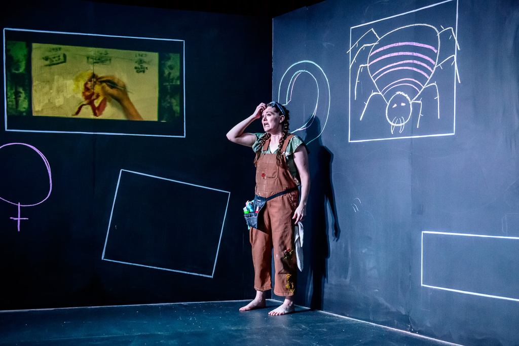Wearing dusty brown coveralls, bare feet, pigtails, and a toolbelt of multi-colored chalk sticks, she performs on a bare stage against a backdrop of chalkboard painted walls on which she draws an ever-changing mural while telling her story. Under the direction of Raja Benz (described in the program as a trans, Filipina-American theatre maker, intimacy educator, and cultural theorist, who uses the pronouns she/her/siyá*), Lucas transforms a few pre-drawn rectangles and a generic head into her child, her child’s friends, her child’s pet tarantula, Beetlejuice, a telephone, a school, a church, a name tag, and whatever else will help her story to move forward. The interactive mural was apparently not part of Edie’s script, but the brainchild of Benz and Lucas. After my initial skepticism, I was completely sold on the chalk drawings and couldn’t wait to see what Lucas would create next. Candace Hudert’s sound design is seamlessly woven into the script and Austin Harber’s lighting adds depth and atmosphere without being intrusive.