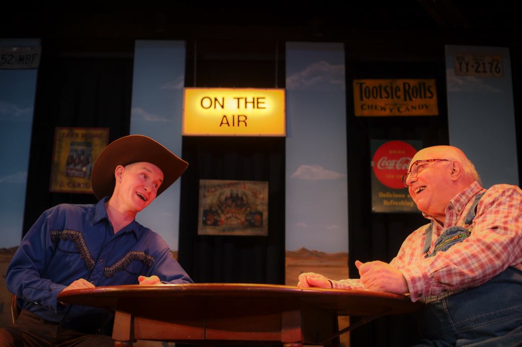 The first in a series of four satirical plays about the fictional town of Tuna, TX, GREATER TUNA requires two actors to portray twenty citizens of this conservative Texas community. John Hagadorn and Bartley Mullin are so good at quickly transforming from one character to another that it’s almost possible to overlook the content they are sharing that is making us laugh out loud. Hagadorn thoroughly encapsulates the town’s KKK leader Elmer Watkins, with his baseball cap pulled low over his eyes and so convincingly inhabits the characters of town matriarchs Bertha Bumiller and Pearl Burrus that we almost forget he is a male actor portraying these stereotypical southern women. Hagadorn is familiar with the inhabitants of Greater Tuna, having appeared in SCM’s production of A Tuna Christmas (2016-2017 season). This is the Mill’s first production of Greater Tuna, the original play, since 1985, and director Mark Costello returned to steer this wild ride and keep it on track.