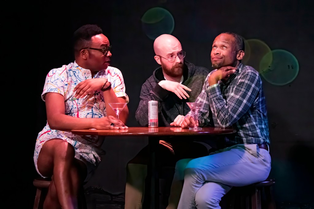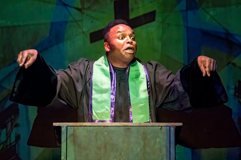Dylan Jones and Zakiyyah Jackson hold down most of the female roles in Sutter’s life. Both play his mother, at different ages, as well as aunties, friends, a sister, and church ladies. In one scene they portray a quartet of women gossiping on the telephone, highlighted by rapid costume changes but my favorite is their second act “non-committal ceremony,” a nasty same-sex divorce officiated by a Zen-like Cashwell. This scene is the embodiment of the adage, “same sex, same problems!”