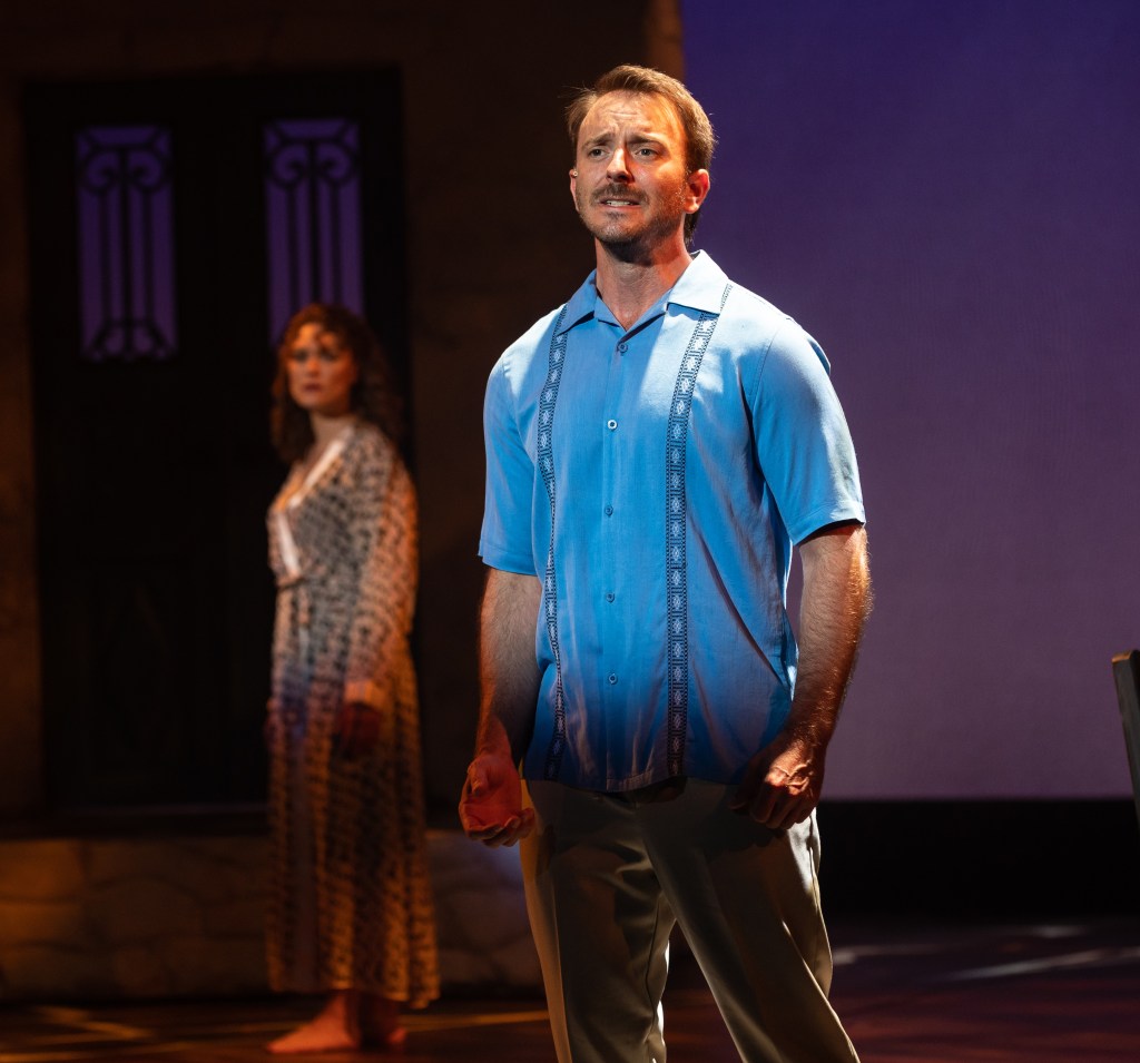 With a large cast and lots of choreography, the set was kept simple with a minimalist rotating design representing Donna’s taverna – which looked somewhat Spanish or Moorish to my untrained eye. Most of the visual effects were wisely focused on the costumes and lighting. The band was placed in the orchestra pit, instead of hidden behind the scrim, adding even more of a Broadway, big-stage feeling. The direction (Happy Mahaney), music (Sandy Dacus), and choreography (Ashleigh King) appeared to work together seamlessly, maintaining a fast pace, a high level of energy, and drawing the audience in willingly. A plot was hardly necessary, but there is an actual story-line, and a sub-plot that make sense and is easy to follow. Mamma Mia! hits the target as a summer musical.