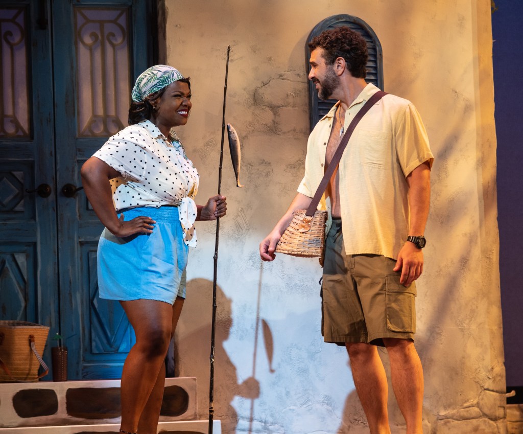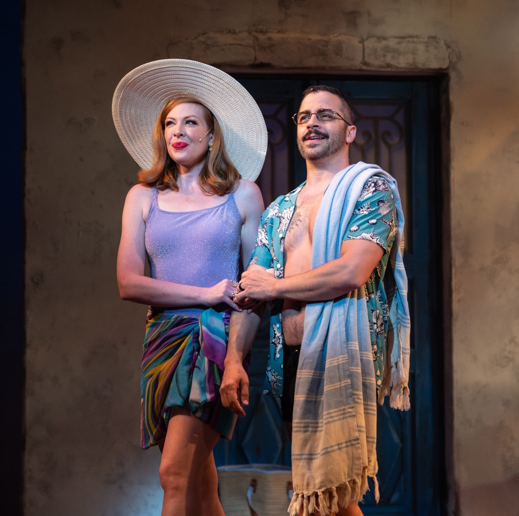 Just as there were three possible dads, the women were cast in groups of three as well. Donna had two best friends, her former back-up singers, Tanya (Garrett) and Rosie (Catrina Brenae), and so did Sophie: Ali (Havy Nguyen) and Lisa (Jana Prentiss). Even Sky (Micah Cook on opening night; a character who was never as fully developed as the women) had two close friends, the flirtatious Pepper (Connor Macchi) and the more dependable Eddie (Johnny Reardon), both of whom worked at the taverna (a Greek restaurant, this one included a B&B) built and run by Sophie’s mother Donna (Thompson).