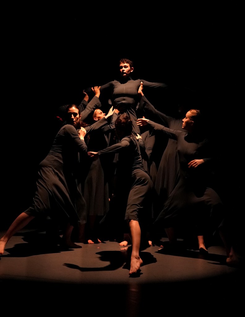 A second new work, Adjusting to the Dark, is performed by a large cast – five company members joined by six guest artists – all dressed in modest dark dresses with high necks and long bell sleeves, reminiscent of choir robes or liturgical vestments. The work actually begins with a prayer, a rendition of Ave Maria, and concludes with Jim Perkins’ A Ritual for Saying Goodbye, an appropriately moody medley of what sounds like violin and electronic yearning. A tug of war of pushing and pulling, caressing and enfolding, silent screams, and a focus on small, riveting hand gestures are all supported by a symbiotic collaboration of movement, music, and an interesting use of footlights. The audience is encouraged to look, listen, and think in new ways. What is your darkness, what are the challenges of your life, and how do you adjust?