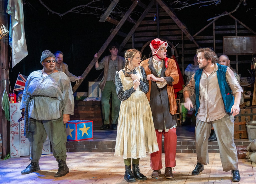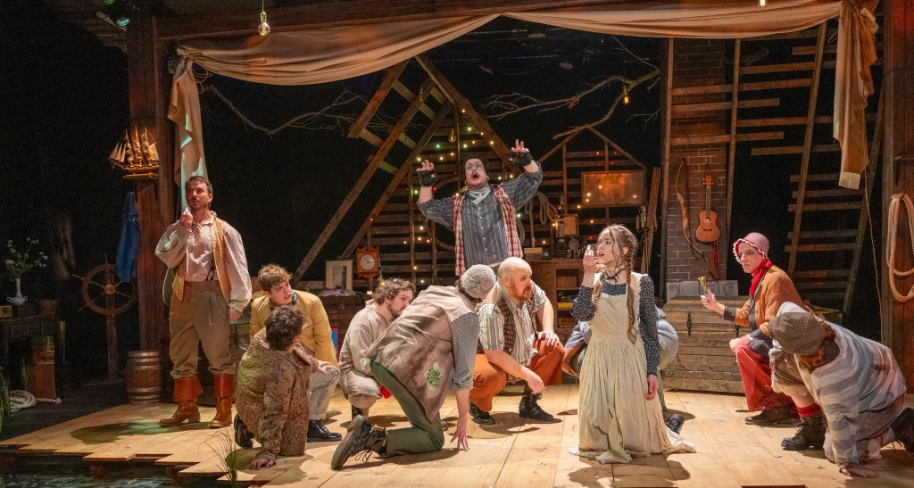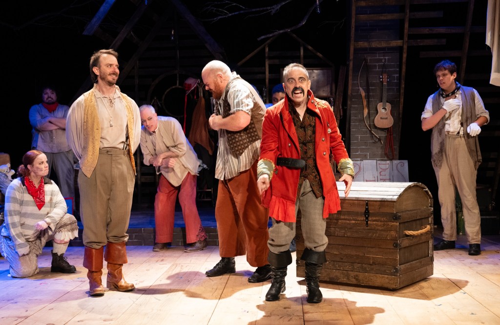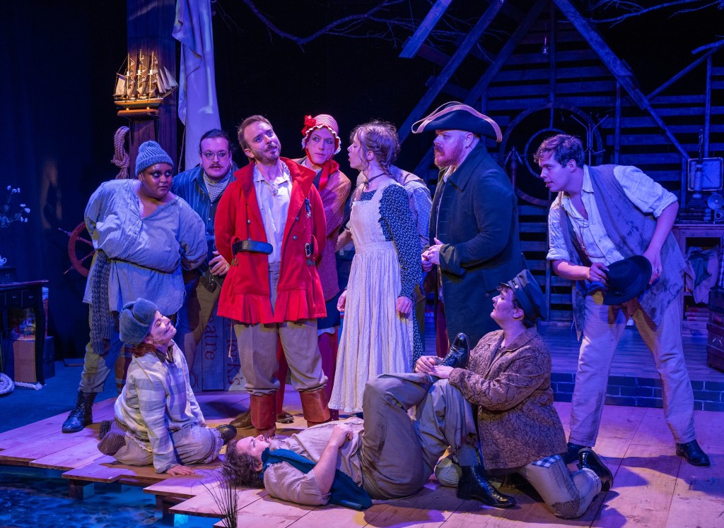 Paul Major plays Black Stache’s bumbling first mate, Smee, who actually spends much of his time correcting Stache’s wildly humorous misuse of words, and occasionally – an accidentally – coming up with some life-saving ideas. Elle Meerovich takes on several roles, including the flask-toting headmaster of the boys’ orphanage, a pirate, Fighting Prawn (king of the Mollusk tribe), and a sailor but their most memorable moment was holding an unwavering note in a song for a thrillingly long time. Whew! But wait, there’s more…
