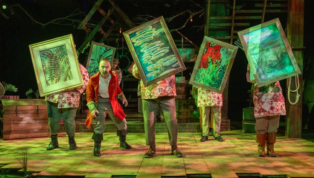 Chewie Lo Moore really digs in as Bill Slank, the cruel captain of The Neverland who switches the treasure chest with the decoy trunk at the start of the adventure, thus activating the action adventure aspect of the play. He also plays Hawking Clam, the son of the Mollusk king, Fighting Prawn. Joshua Mullins plays a supporting role as the good Captain Scott, the captain of the Wasp, based on a real-life British Royal Navy Officer of the same name, as well as – ironically – an incompetent sailor named Mack.