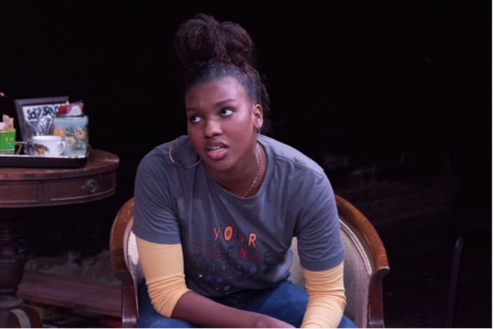 The two disagree on a key tenet of Zoe’s paper, the impact of slavery on the outcome of the American Revolution. At first I was unclear who initiated this meeting. A synopsis of the play in the program indicates that Zoe is called into her professor’s office to discuss her paper, while Dr. T. and Zoe (Mikayla LaShae Bartholomew) hold the view that Zoe initiated the meeting to make sure she’s on the right track before submitting the final paper. It’s a small detail, but knowing how the actors see it provides some insight into the development of the play.