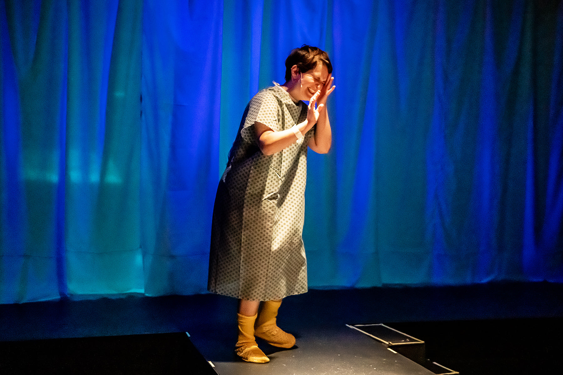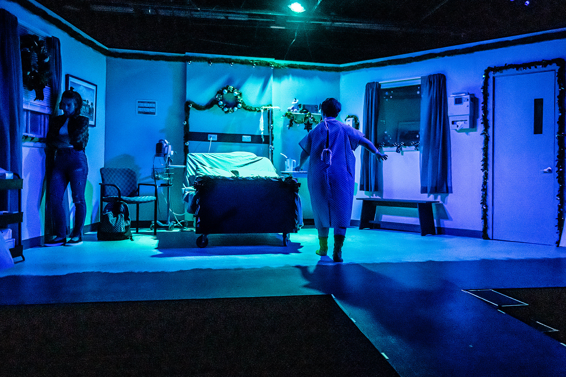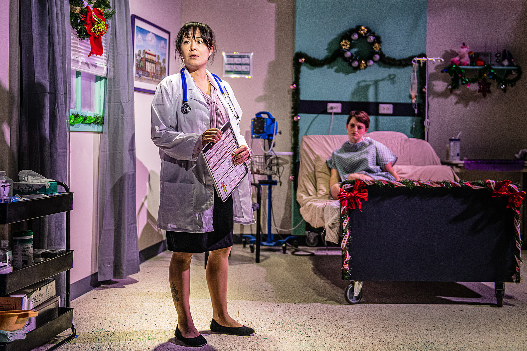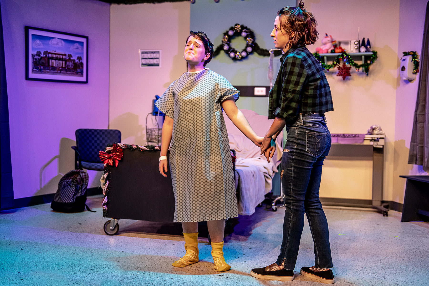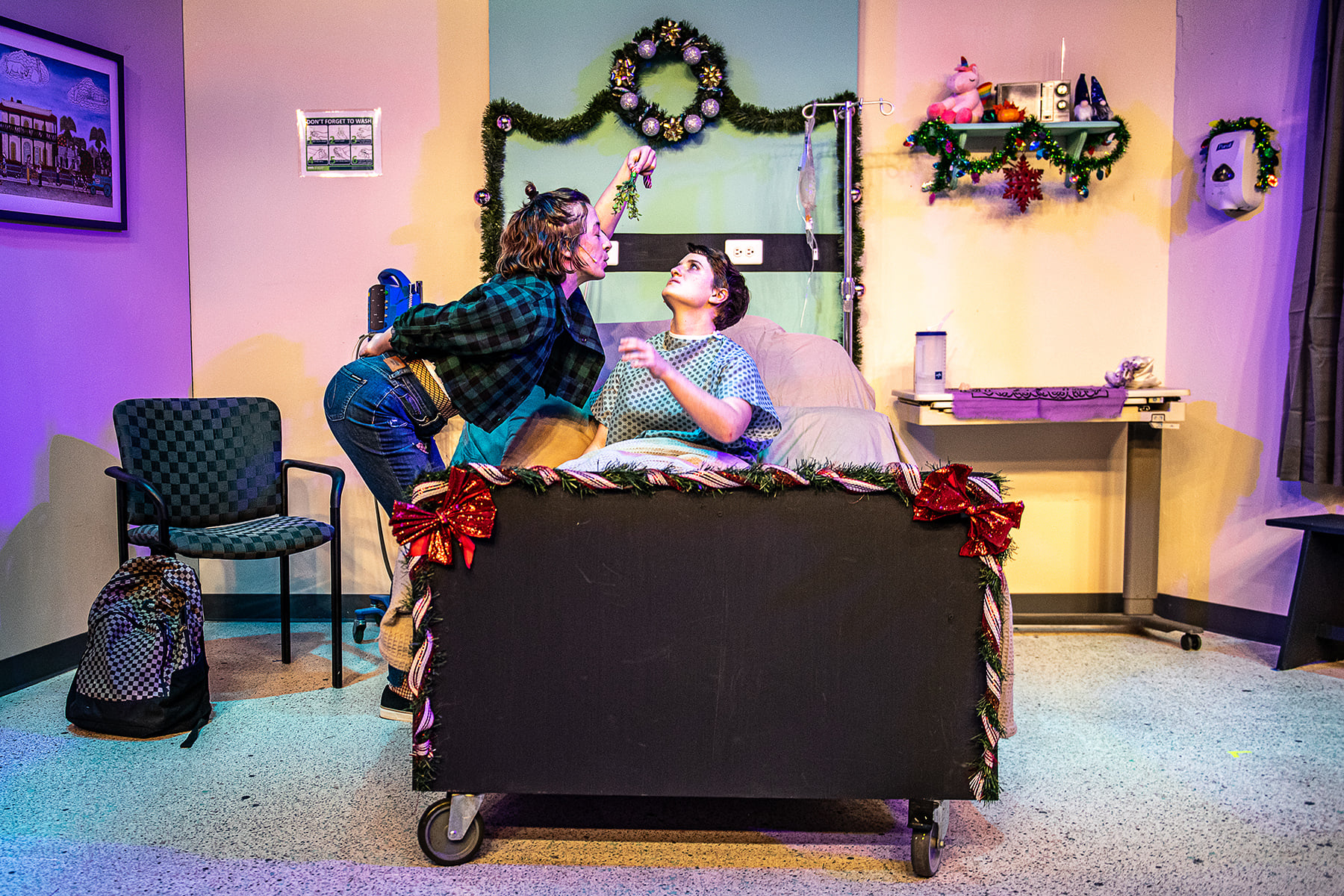 There is obvious love between Jay and Leigh, more powerfully demonstrated when Leigh sings, “I Will Care For You” while Jay sleeps that in any spoken words. But Jay’s unnamed illness – some sort of cancer, it seems – is like an intrusive third party in their relationship. Jay easily balances talk of DNR forms with jokes that slide easily off the tongue, much to Leigh’s chagrin. They are both, it seems, grieving Jay’s imminent departure, but in diametrically opposed ways. When Jay wails, “When you’re dying on Christmas, Christmas doesn’t seem so great,” there is a hint of humor, but when Leigh screeches, “you want to un-alive yourself,” it feels desperate. There is a lot of door slamming, and I hope the set can hold up to the trauma for the duration of the run.