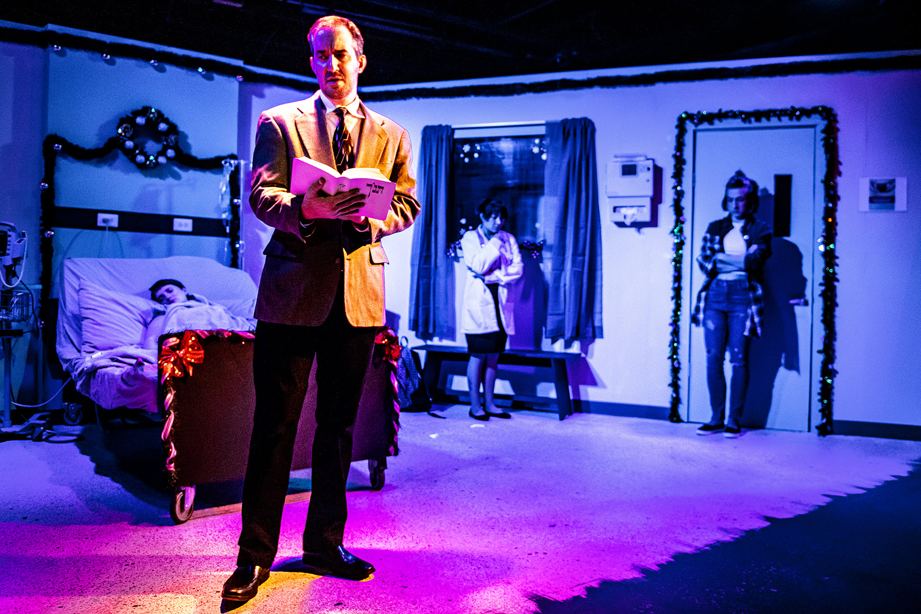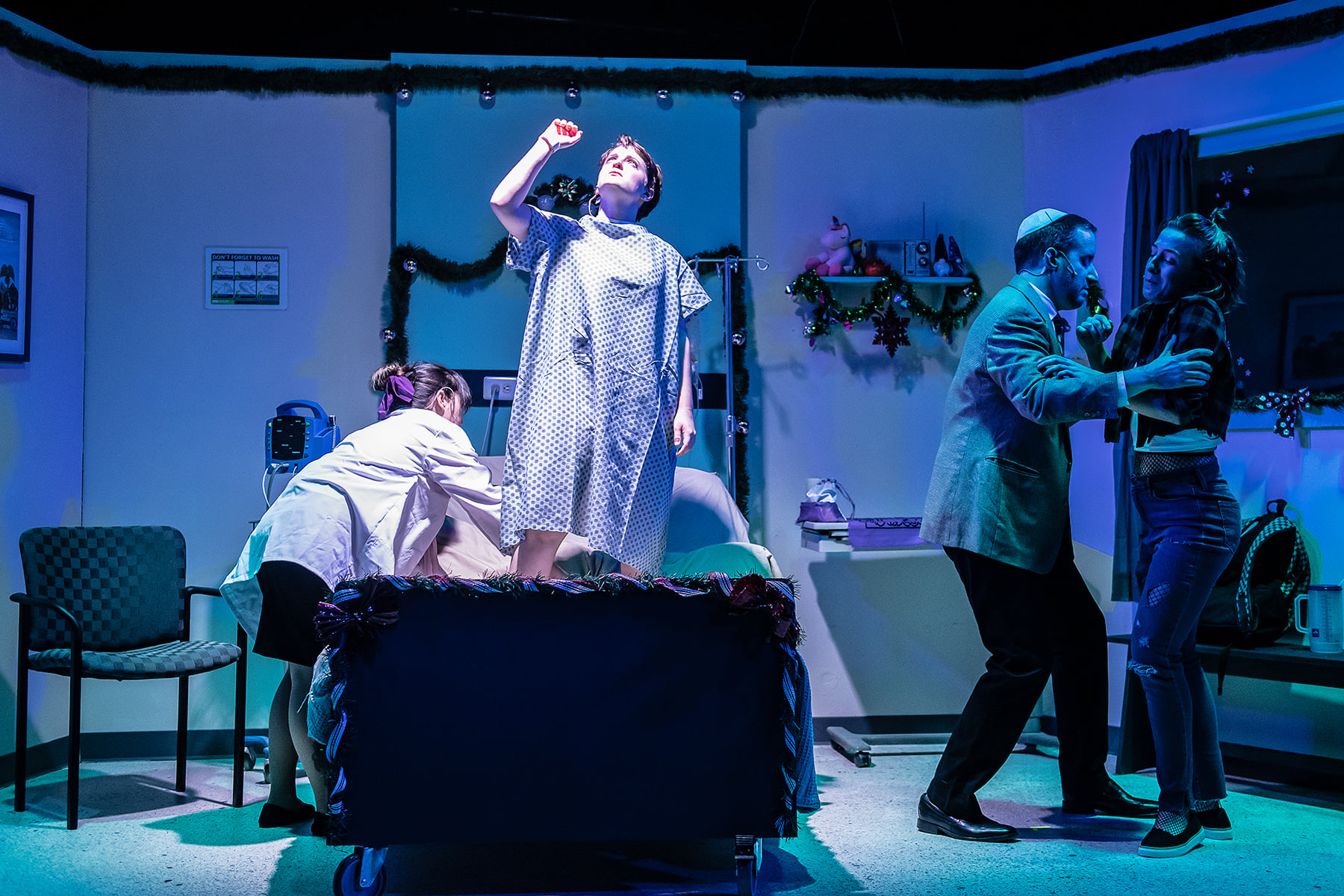 Leigh rebuffs all attempts to help, brazenly insulting Dr. Martinez and ordering Rabbi Edelstein to get out of the room. And that brings up another question. What, exactly, is the deal with the spiritual elements of A Christmas Kaddish? There’s more than just the obvious Judeo-Christian background and conflicts, by the Christmas decorations that adorn Leigh’s large private hospital room and the persistence of Rabbi Edelstein, who so graciously persists in the face of Leigh’s escalating anger. There’s a third spiritual element, but I don’t want to spoil the fun, so after you see the show, comment here on this blog, and let us know what it was.