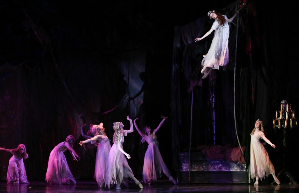 Dracula is also quite different from most classic ballets. The women of the corps who dance the roles of Dracula’s brides may initially remind you of the Willis in Giselle. They have been tasked with dancing gracefully and on pointe while carrying their arms stiffly in front of them, affecting the posture of the ”undead.” To do this while maintaining flexibility and gracefulness throughout the rest of the body must have been a challenge. There are flying dancers in several scenes (Anne Sydney Heatherington and Valerie Tellman-Henning were credited in the program, but I thought there was a third as well) and some impressive pyrotechnics near the end when Dracula is finally hunted down and destroyed by Frederick, Svetlana’s innkeeper father (Gabor Szigeti), and the village Priest (Jack Miller) – and while these effects proved to be delightful for adults and children alike, there were many themes that dealt  with morality and sexuality that were not recommended for children under the age of 8.