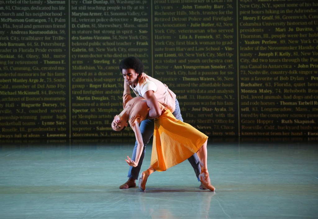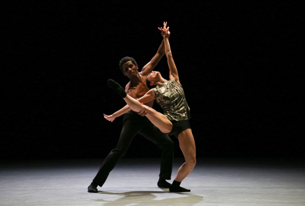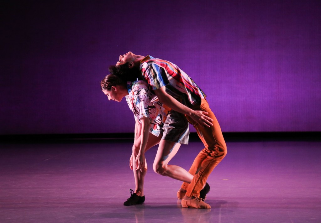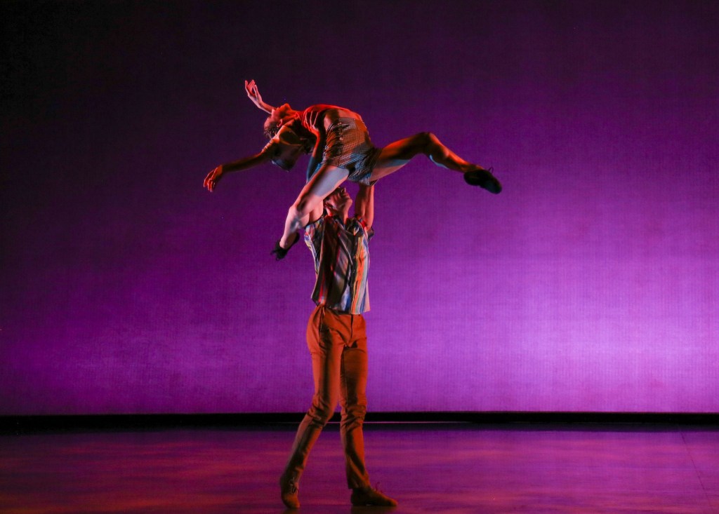 The program opened with a colorful, upbeat work by Joshua L. Peugh, the New Mexico-based founder and artistic director of Dark Circles Contemporary Dance. Slump defies categorization with its musical environment ranging from Klezmer Juice (described online as Jewish Soul musicians) to Peruvian singer Yma Sumac to jazz icon Ella Fitzgerald. The women are dressed in 1950s-style party dresses with crinoline underskirts that give a sassy nod to tulle tutus while emphasizing the pointedly un-classical and often upside-down lifts with one leg hooked around the partner’s neck.