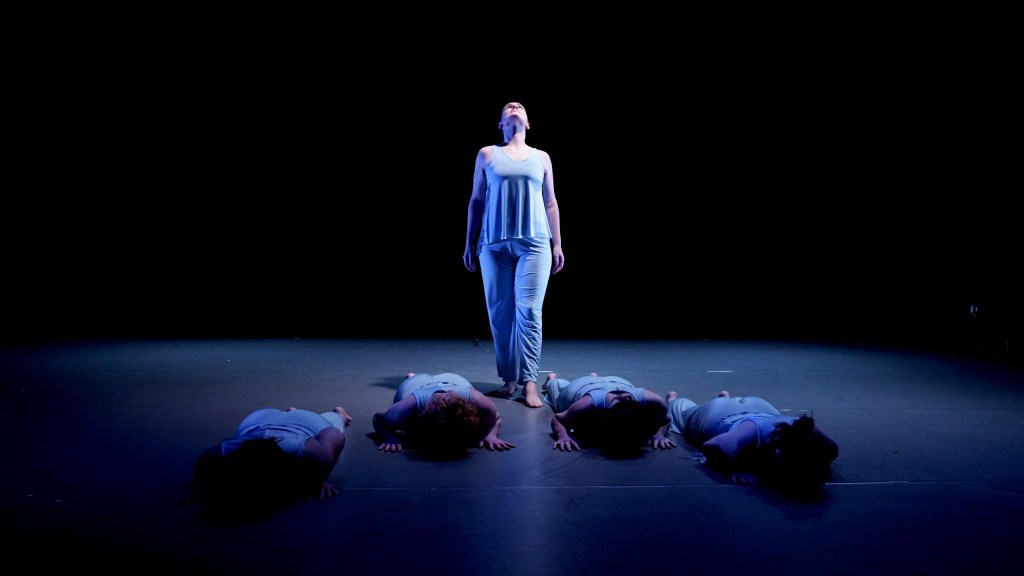 And that takes us to the second part of the program, the titular In Rest and Sleep, first seen at TheatreLab the Basement just a few short years ago. Seen with different dancers – or dancers in different roles – in a different space, the work is just as impactful as it was on its debut, if not more so. This time, Foster selected members of the audience to gently toss lilies onto the stage at the start of the piece. Three dancers were laying quietly on the stage, where there were also two large patches of artificial grass. A fourth dancer waited at the edge of the stage, also holding a flower.