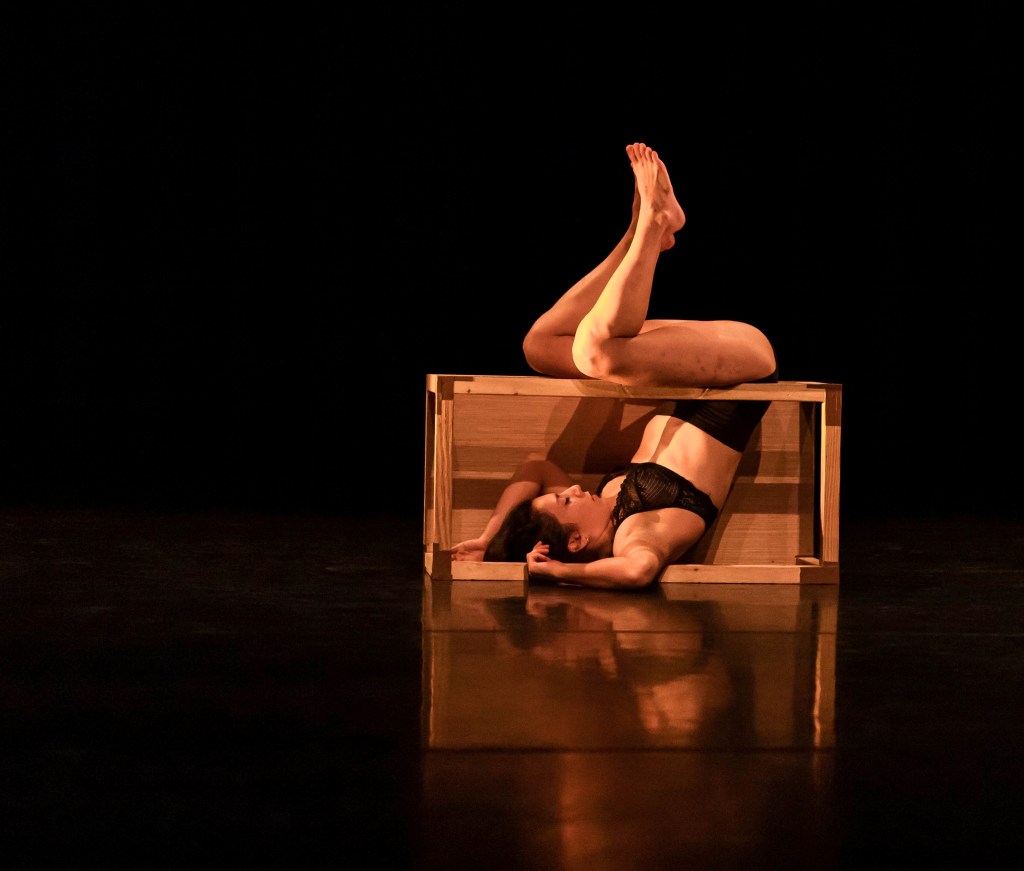 The program also included Circular, a duet by Roxanne Morgan Rowley, performed by Rowley and Sara Goldman, that explores the circularity of relationships between two women; and Luisa Innisfree Martinez’s hilarious Trope in a Box. Performed in, on, and under an open sided crate, Martinez’ solo uses comedy and strong, acrobatic movement phrases to examine and deconstruct themes and tropes of femininity. The program concluded with Starr Foster’s new work, Stripped, a trio that explores identity. The three women become entangled, connect, collapse, support one another, and finally seem to reach a place of calm, peace, and acceptance.
