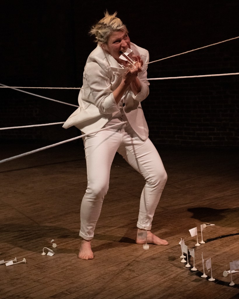 This section of the artist’s evening-length work is called “Aftercare,” and the work explores the question, “What does it feel like to say the dark things that remain inside out loud?” Based on the dancers’ shared experiences with trauma, the two begin on opposite sides of a small table, somehow, remarkably, performing similar movements with strikingly different dynamics. The force and counterforce reminds me of the life and death encounters being negotiated by the old men convened around Kurt Jooss’ The Green Table but her it takes only two, not a dozen, to create this howling, apocalyptic effect!