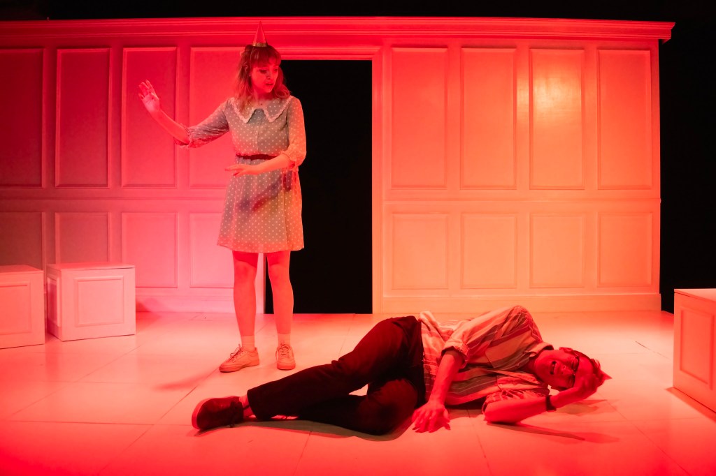 Radiant Vermin is performed with a minimalistic set designed by Daniel Allen. A simple white wall – wainscotting or molding, I think it’s called – and a trio of  matching white boxes with hinged lids that hold the few simple props, such as some candle sticks and party hats. There is no other furniture and we depend on the actors to create the changes of scene.