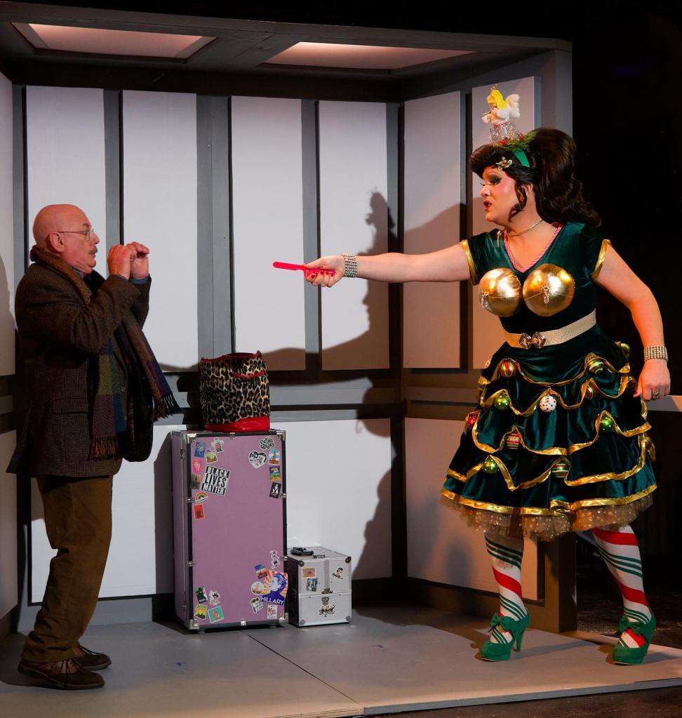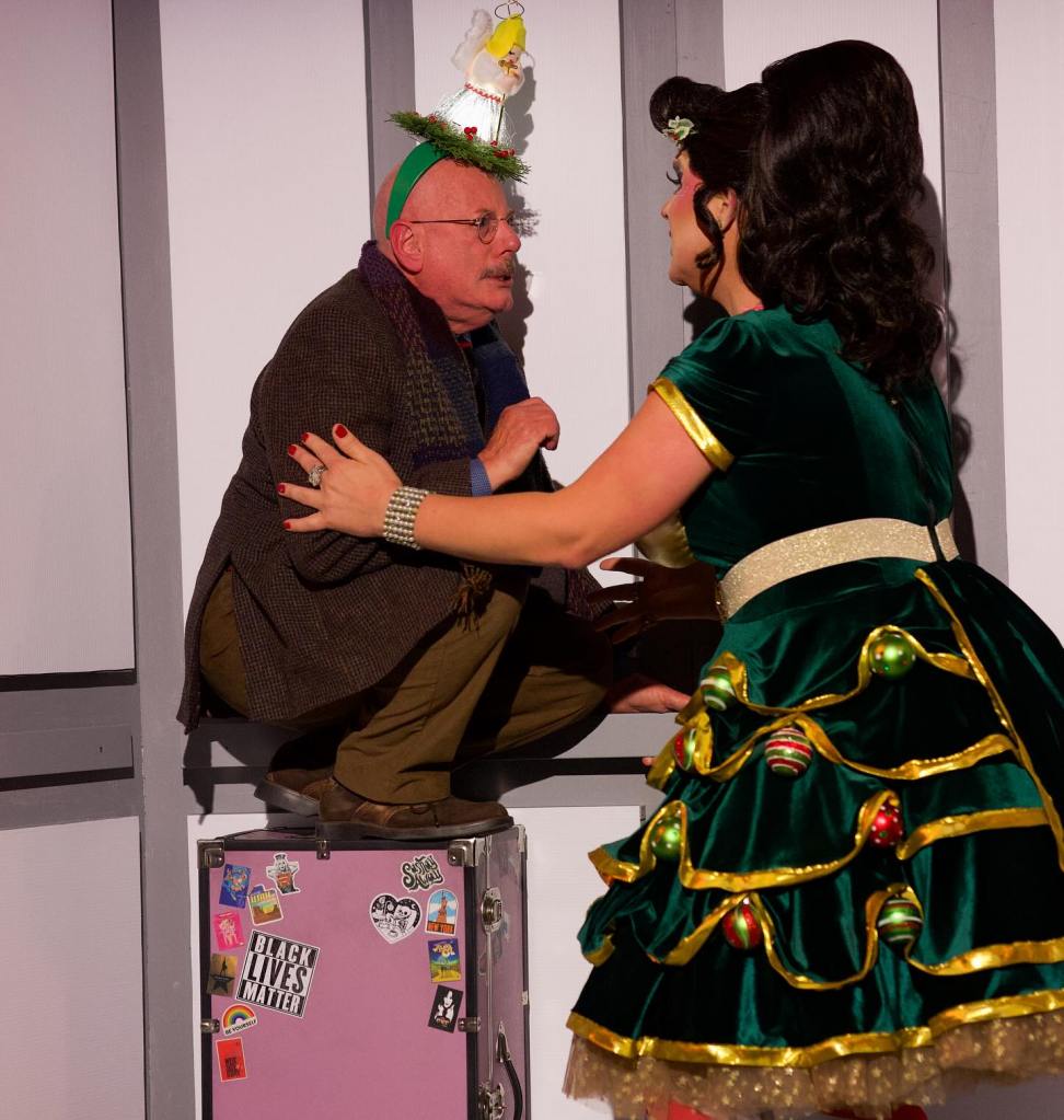Emily Adler, who plays the snide and omniscient Miss Dee, also briefly takes on the role of Kay, one of the homeless “renovators.” This scene brought me near tears, as Kay, after sharing the testimony of her traumatic childhood and life on the streets, gladly offers herself as a sacrifice, giving Jill a kiss on the cheek before heading off to meet her demise at the end of Ollie’s “magic wand.” Whew!
