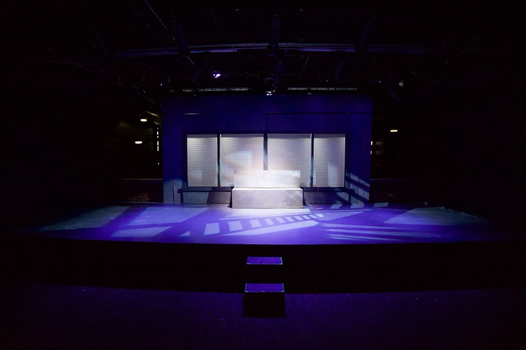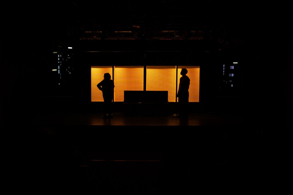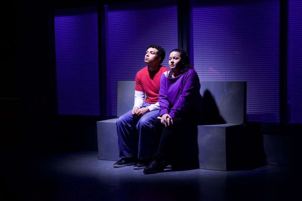 SANCTUARY CITY runs about 90 minutes with no intermission, but it does have two distinct parts. The first half or so takes place in a minimalist setting, with a simple bench set in front of a wall of windows. Dasia Gregg’s scenic design is gray and institutional, deliberately lacking in the details that suggest hominess and permanence. It looks like a bus station or a waiting room in a government building, but it serves as a variety of locations from B’s bedroom to the high school gym where B and G attend their senior prom. For the second half, the bench is removed, and the wall of windows opens up to reveal B’s apartment – presumably, the same apartment he inherited when his mother, fearing deportation, returned to her home country, leaving B, a 17-year-old high school student, to fend for himself.