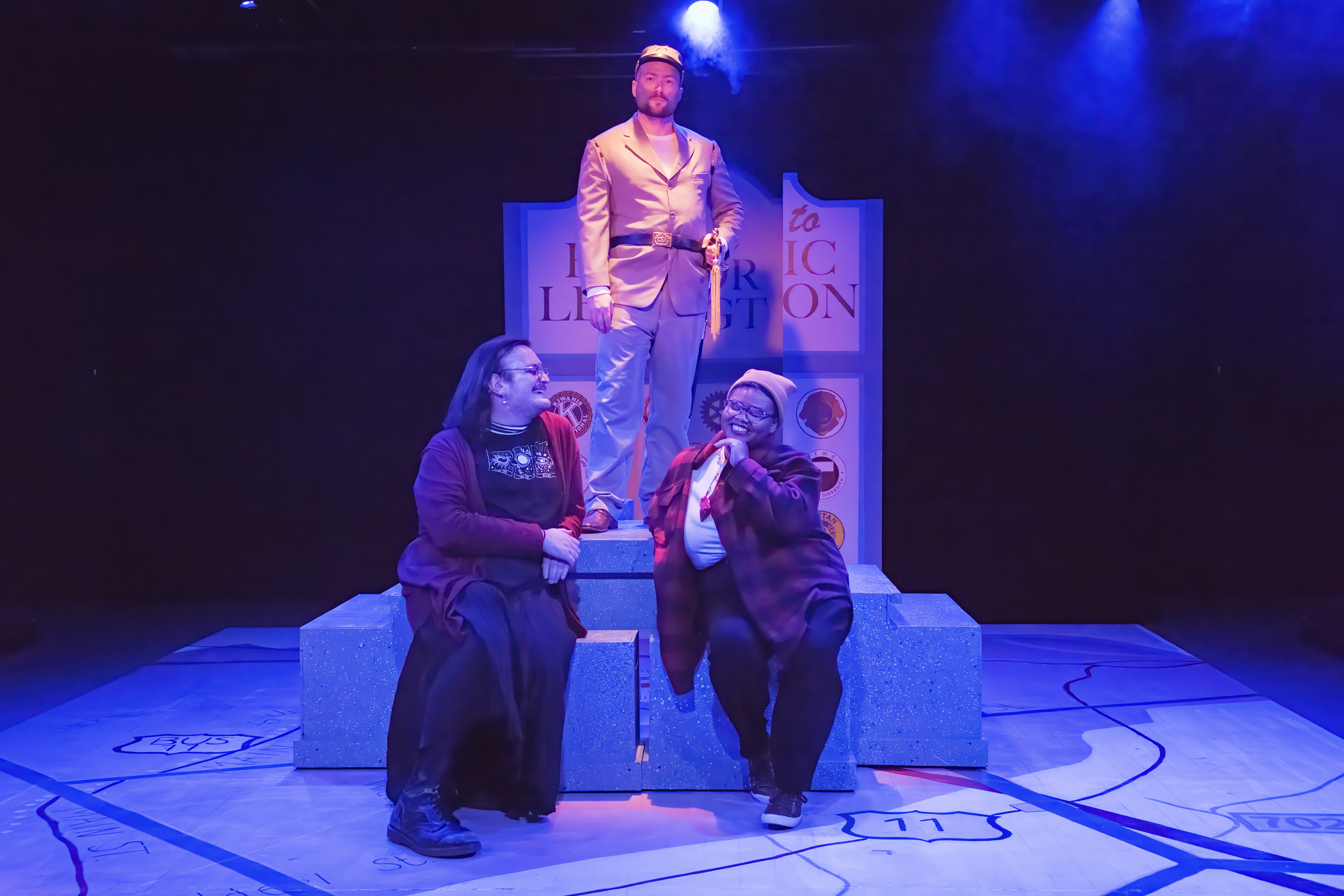 There is an experimental and inclusive nature to this work as well. Audience members are asked to take a number from a ticket machine as we enter. While the purpose is never explained, it eventually becomes clear that each ticket has been re-designated as either a “1,” a “2,” or a “3.” The three actors do not know, at the start of the show each night, which of them will be playing the role of “1,” “2,” or “3” until the audience chooses, by applause. [I applauded equally loudly for each because I know and admire Keaton Hillman and Tedarryl Perry as actors and was immediately drawn to Garrett D. Reese’s “extra-ness.”]