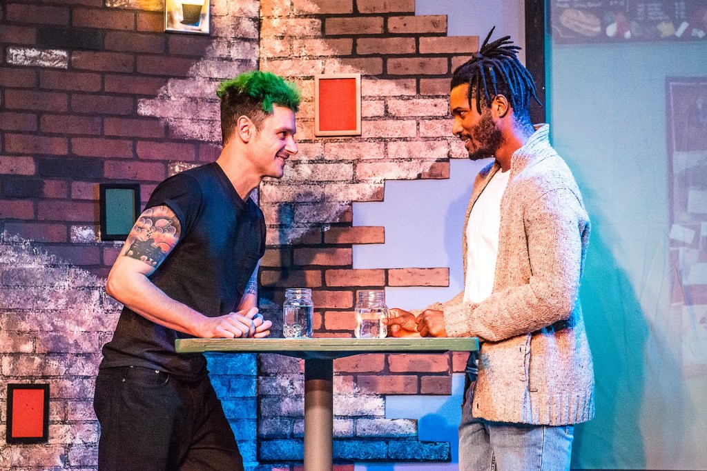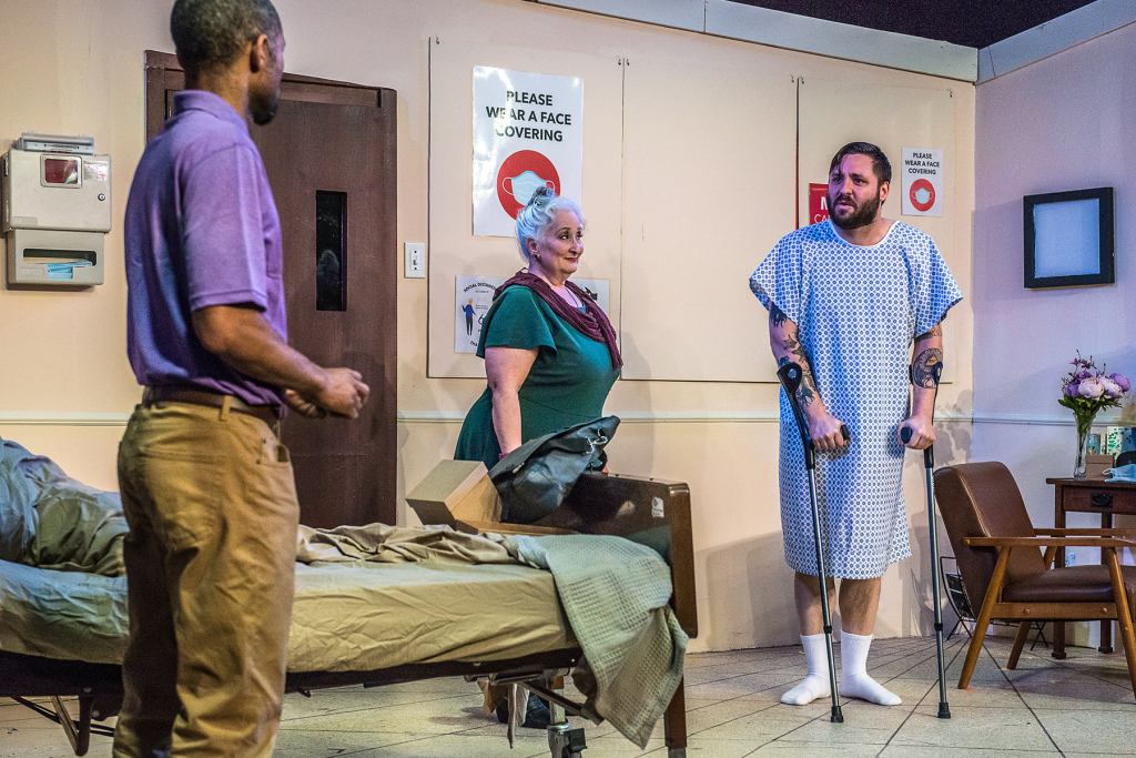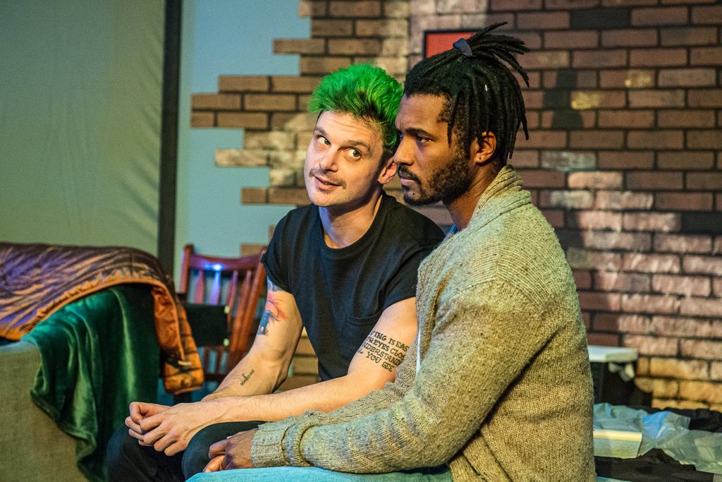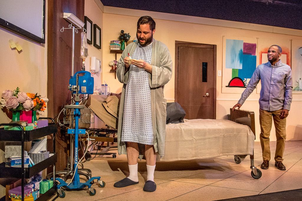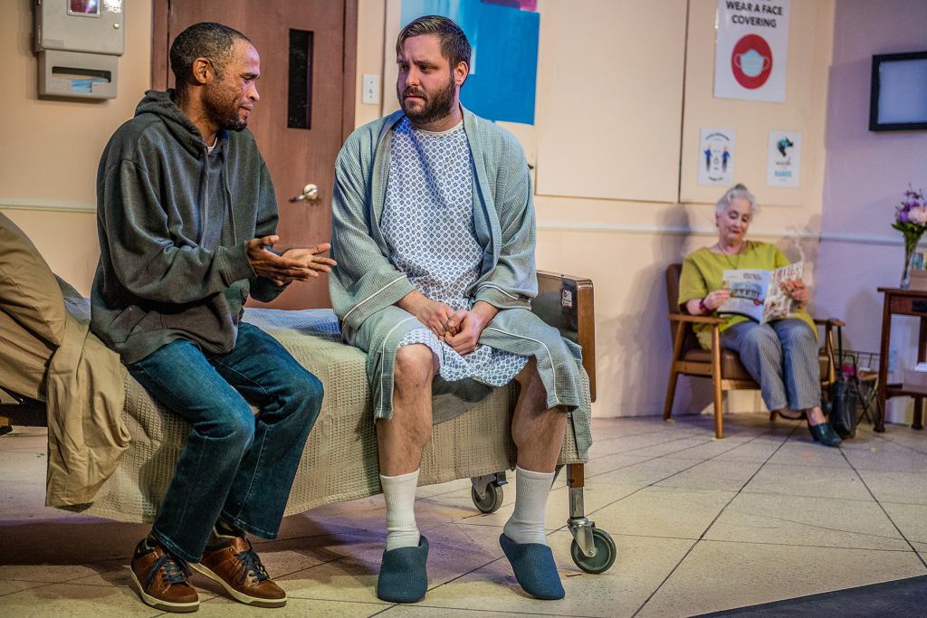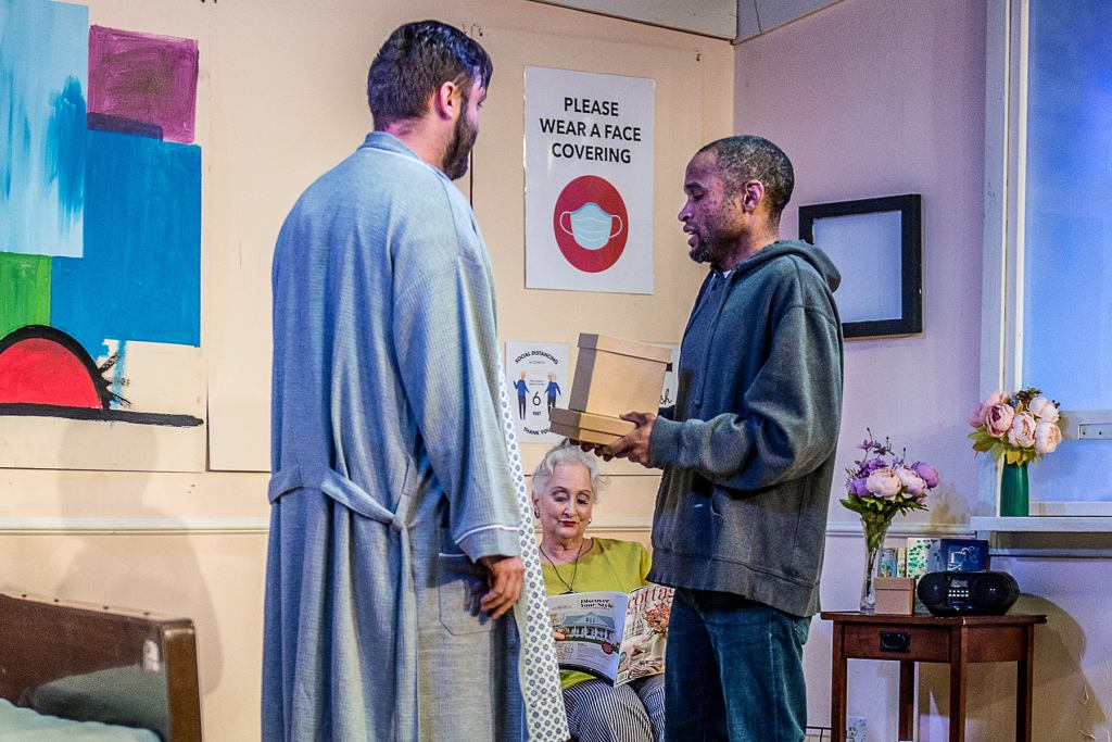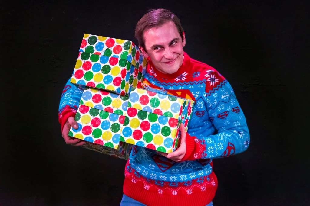 Adam Turck is the caring insightful sibling, Drew. Axle Burtness plays Jake, the impatient sibling who wants to fix his older brother, regardless of what Matt actually wants. And Matt, played by Patrick Rooney, a newcomer to the Richmond stage, appears to be a caring, lovable man who, despite his Harvard education, seems barely able to articulate his own feelings. An Ed? Well, Ed is from another generation. He helps his neighbors, even when it isn’t convenient, like on Christmas Eve. Christopher Dunn’s character lovingly hangs Christmas stockings on the mantle, and gently pauses when he comes to the fifth – the one that belongs to his late wife – retuning it to the Person in Charge. Who can’t relate to the loneliness of an old widower celebrating his first Christmas without his beloved wife? And therein – herein? – lies the problem. Why should we, the audience, care about the feelings or problems of privileged straight white men?