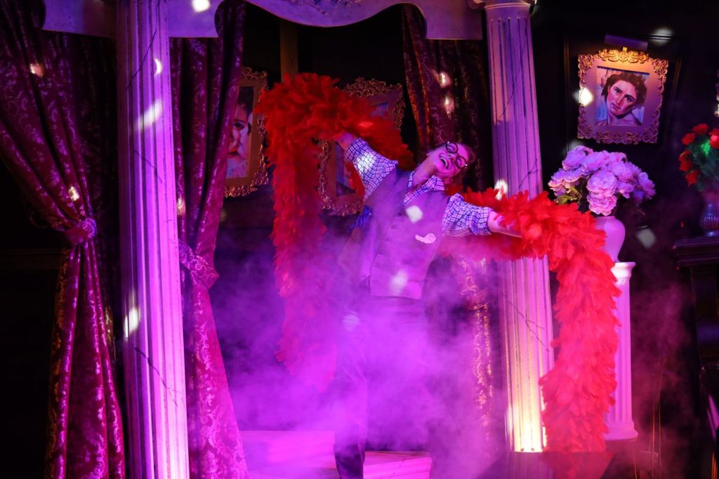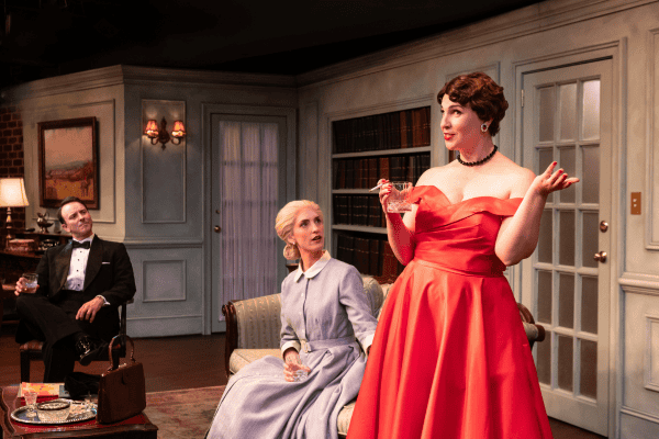 First, there was a bit of video, providing some background on the kidnapping of a little girl, Daisy. Then Hercule Poirot (Lawrence Redmond) gave a brief introductory curtain speech. In the brief time it took Redmond to speak, the crew transformed the previously bare space consisting of little more than a fat white screen into a passable representation of luxury hotel dining room. Three-dimensional set elements and two-dimensional projections and lighting effects blended in a collaboration that set new standards. Were those pedestrians moving outside the hotel windows? Or were they crew preparing for the next scene change? Either way, they added depth and nuance to the visual presentation. Kudos to scenic designer Chris Raintree, projection designer Tennessee Dixon, and lighting designer BJ Wilkinson.