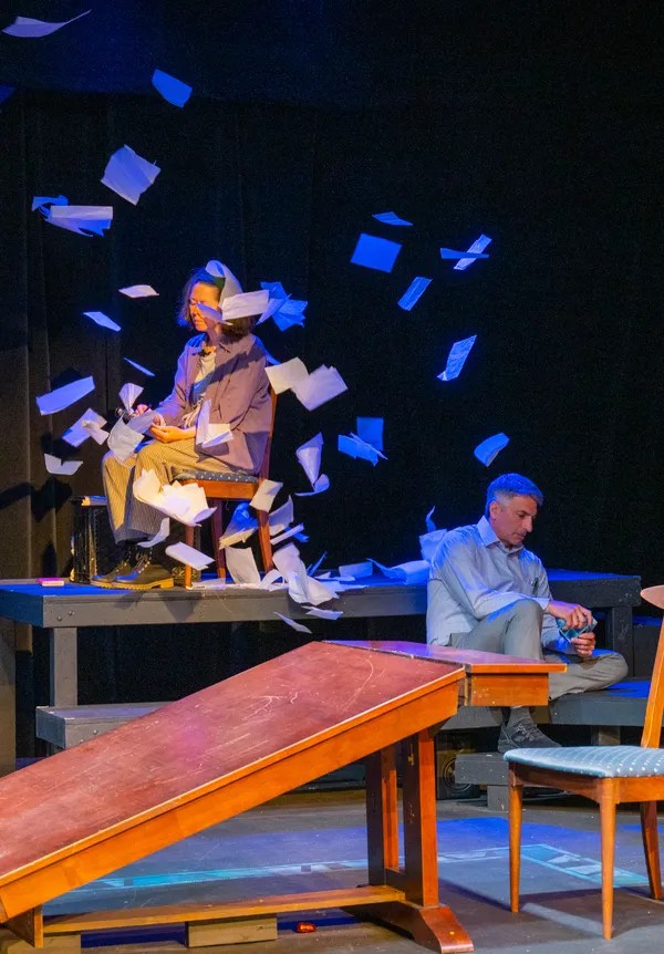 The inaugural production of the Lynn Theatre’s new Studio Series, Jump Baby is a collaboration involving the development of new work by underrepresented voices (Rachel Landsee, a female veteran and military attorney), professional actors (Rachel Rose Gilmour and Adam Turck), and students (onstage and behind the scenes). It has catchy tunes, cadences, a logical story line, and humor. The minimalist set of boxes and graded planes studded with rivets provides an appropriate and versatile background, especially when creatively lit in a kaleidoscope of colors – or in red, white, and blue. Little touches, such as having the ringing of a cell phone voiced by an actor instead of a recording of an actual cell phone demonstrate a commitment to the process.