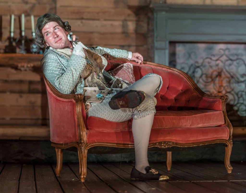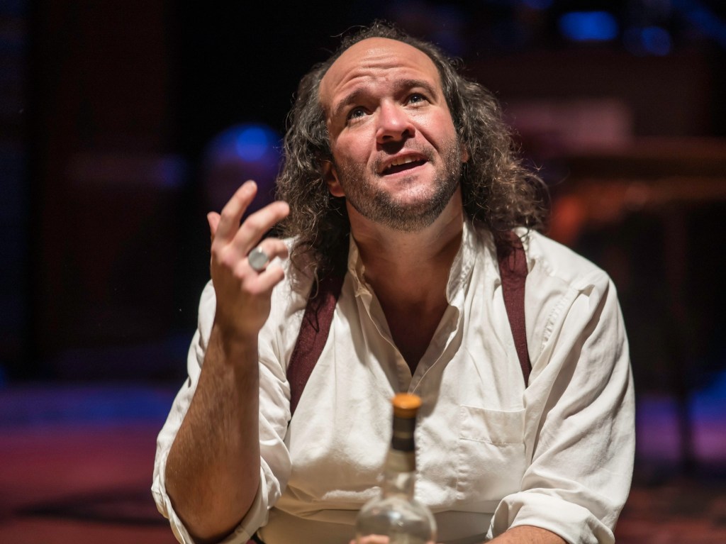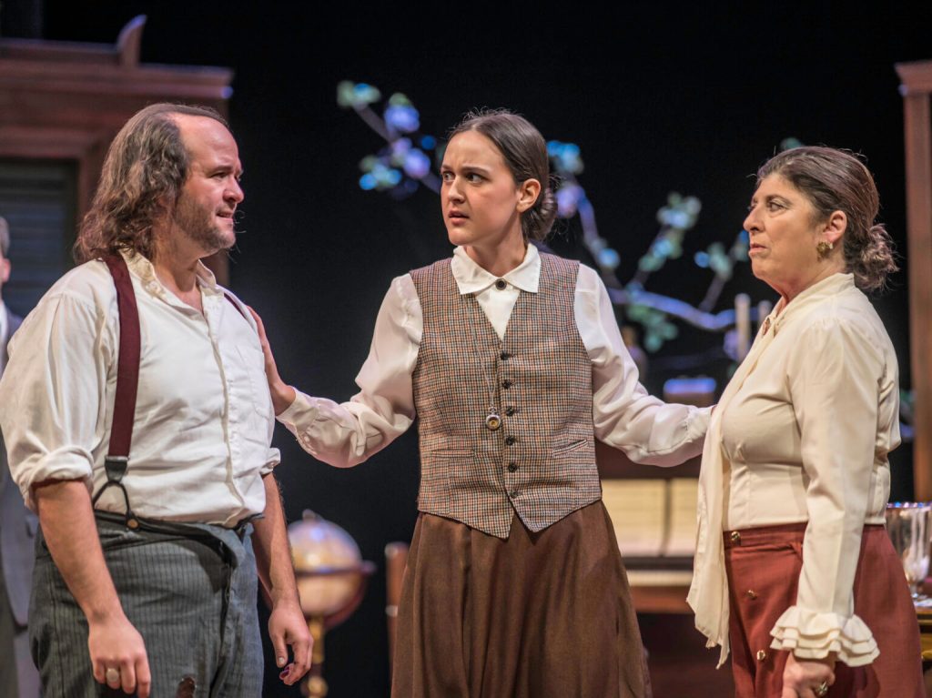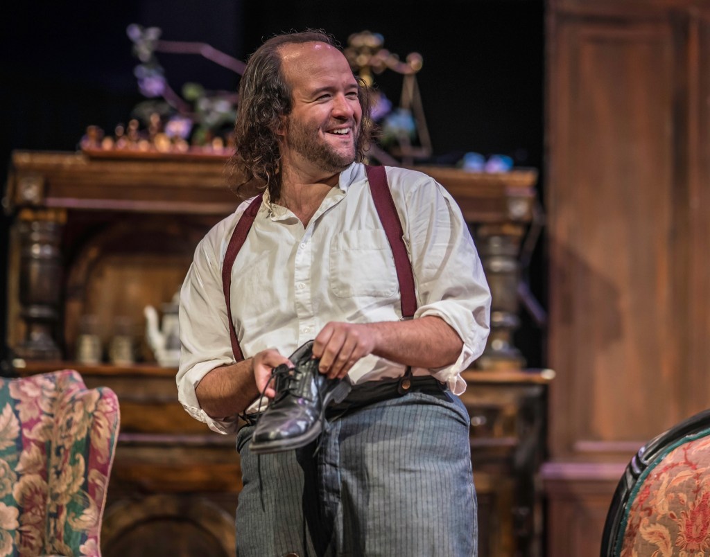 Long Day’s Journey into Night is difficult to watch – and not just because it’s long. There is the subject matter, which might be triggering for some. The father, James Tyrone, was a successful but now fading Irish-American actor who dabbles in real estate investment, drinks too much, and is somewhat of a miser. In one hilarious scene he climbs atop a table to twist on the bulbs of a chandelier because his son complained about his miserly ways. He had been sitting under the light of a single bulb to save money. (In retrospect, I wonder if he rotated the lit bulb, so they would burn out evenly…) Another humorous moment occurs when James suddenly becomes aware that his sons have been watering down his prized whiskey. Matt Radford Davies plays the domineering, frayed at the seams actor with apparent ease and reveals the positive and negative aspects of James’ personality is a way that paints him as neither all villain nor all hero. It feels as if Davies has walked in Tyrone’s/O’Neill’s’ shoes, or at least tried them on long enough to absorb their essence.