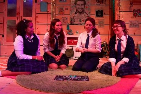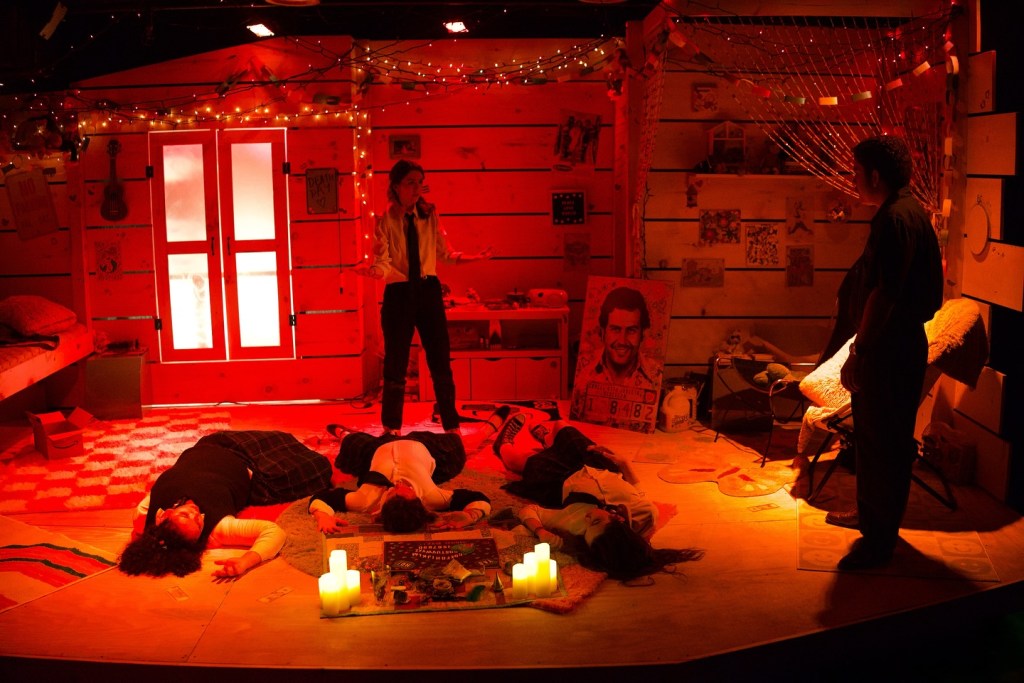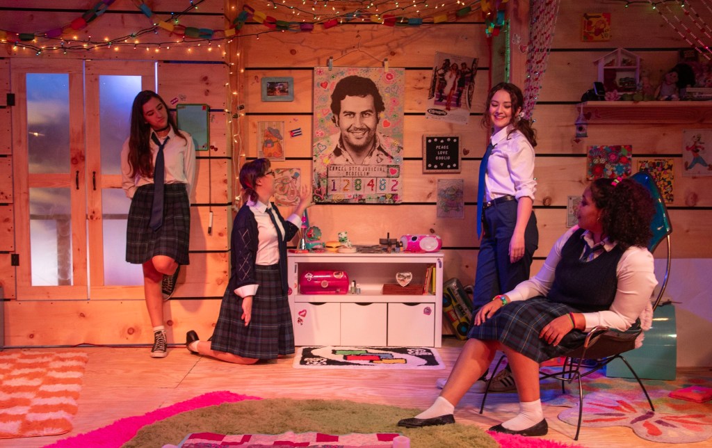 Okay. So, there’s that. But there’s also witchcraft, a Ouija board, a séance, and a special dance choreographed in honor of . There’s a diverse cast, each with a heavy burden of her own. Pipe, the club’s president, is an upper-class Cuban-American and carries the burden of grief from her younger sister’s death. Pipe’s bestie, Squeeze, is Puerto Rican-Haitian who is allergic to cats. Her father committed suicide. Zoom, Pipe’s Jewish-American neighbor, is the baby of the group, and always trying to keep up. Perhaps in an effort to over-compensate for her youth and lower status, she is also coping with the possibility of a teen pregnancy – which factors in the play’s climax. And then there’s Kit, a Columbian-American newcomer with a mysterious past that makes the other girls speculate that she may be the actual daughter of their hero, Pablo Escobar.